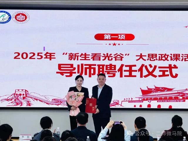 在随后举行的“新生看光谷”大思政课活动导师聘任仪式中,马克思主义学院党总支书记金殿中为黄龙山社区党支部书记邱颖颁发聘书,正式聘请其担任“新生看光谷”大思政课活动导师。