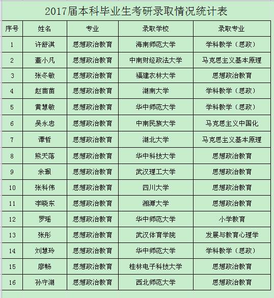 马克思主义学院2017届本科毕业生共计37人。截至6月7日,研究生录取16人,选调生录取2人,另有3人通过省公务员考试笔试,等待面试考核,自主创业1人。
