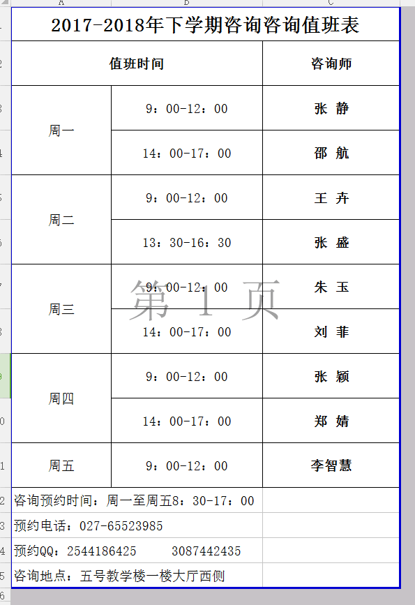 2017-2018年下学期心理咨询值班表