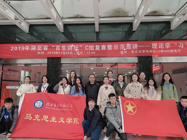 本网讯(通讯员余婵)11月24日,2019年湖北省“百生讲坛”竞赛C组复赛暨示范巡讲在长江大学(荆州校区)举行,我校马克思主义学院2017级思想政治教育1班团支部代表学校参赛并入围决赛,获评“百生讲坛”省级活力团支部之金牌团支部称号。