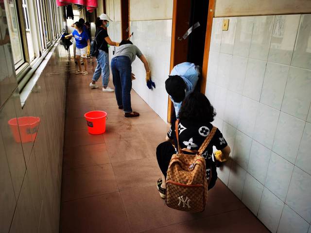 6月18日上午,刚刚结束6月份支部主题党日活动的集中学习,全体党员就由教工支部书记肖潇、刘雯带队,备齐清扫工具,全副武装来到中区1栋4、5层和4栋6层,热情高涨、干劲十足地投入到清扫学生宿舍楼的劳动中。16日下午,行政人员曾经来清扫过一次,但是由于中区宿舍外墙构造与其他宿舍楼不同,玻璃窗特别多,合适的工具准备不足,效果不太理想。“今天的擦玻璃神器还可以!……这个墙壁的瓷砖要先喷湿,用刮刀铲一下污垢,再擦才会更干净……”党总支书记尹德蓉忙碌着给大家示范如何使用工具。“门上的窗户金属框要用干净扫帚把灰先掸下来,灰尘下来了最后再清理地面……”院长黄红发不顾灰尘落了一头一脸,双手举着长杆打扫门框。连宿管阿姨都忍不住拿出手机拍照,夸赞道 “你们准备的真好,做的又仔细,这样清理才真的干净!”窗户明亮了,楼道清爽了,扶手干净了,看着劳动成果,大家疲惫的脸上都露出了欣慰的笑容,为了学生的卫生安全和身体健康,再累也甘愿!
