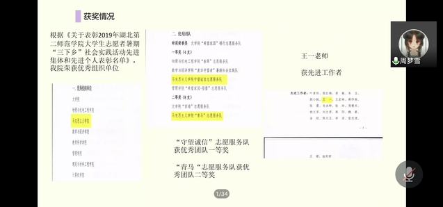 会议伊始,2018级思想政治教育1班周梦雪带领全体成员回顾2019年“三下乡”暑期活动,让同学们更加深入了解“三下乡”活动的意义所在。学院青年志愿者协会副会长2018级思想政治教育1班何辛茹,对2020年“三下乡”活动围绕本次“三下乡”活动主题、活动类型、活动要求和团队需要材料四个方面展开详细介绍,指明相关要求,并提醒尚未参加团队或个人暑期社会实践的同学尽快报名。