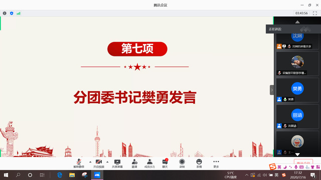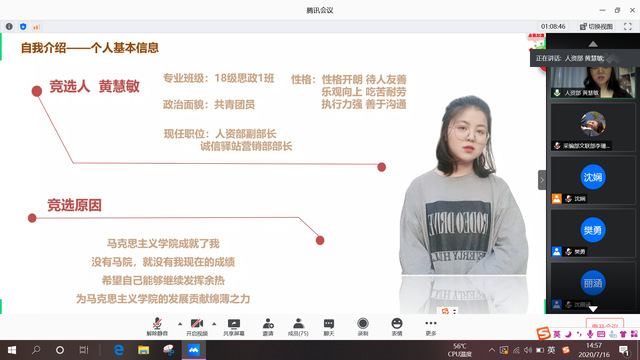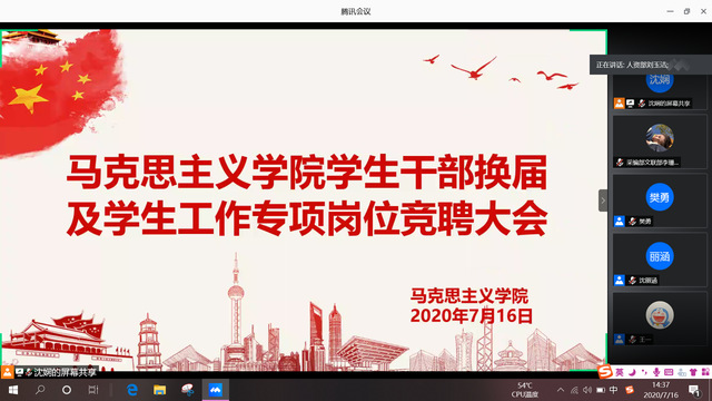 本网讯(通讯员 李珊露)7月16日下午,马克思主义学院通过线上腾讯会议开展分团委学生干部换届及学生工作专项岗位竞聘大会。马克思主义学院党总支副书记宋平、分团委书记樊勇、辅导员王一及分团委全体成员与会。
