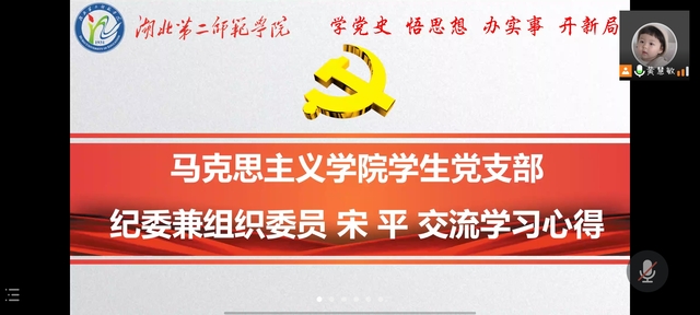 会议伊始,宋平向学生党支部全体党员分享自己的学习心得。他指出学习党史的重要性,并阐述了中国共产党一百年来的不容易;他结合当下疫情现状指出,中国共产党在灾难面前,冷静思考、沉着应对,实现了全国人民逐渐摆脱新冠疫情。此外,他鼓励学生党员要充满自信,紧跟党走,了解为新中国发展做出贡献的英雄事例,学习时代楷模的精神。