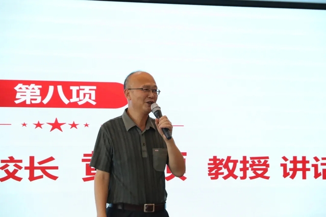 副校长黄颂通过“一个故事、一段经历、一个祝福”给予新生鼓励。他首先讲到了自己一名学生成长的故事来提醒同学们要拥有超越自我的决心和目标。随后,他结合自己曾多次报考研究生的奋斗历程来告诫同学们要有锲而不舍,愈挫愈勇的精神。最后,黄颂祝愿各位新同学在四年之后会以一个全新的自我踏入人生新阶段。