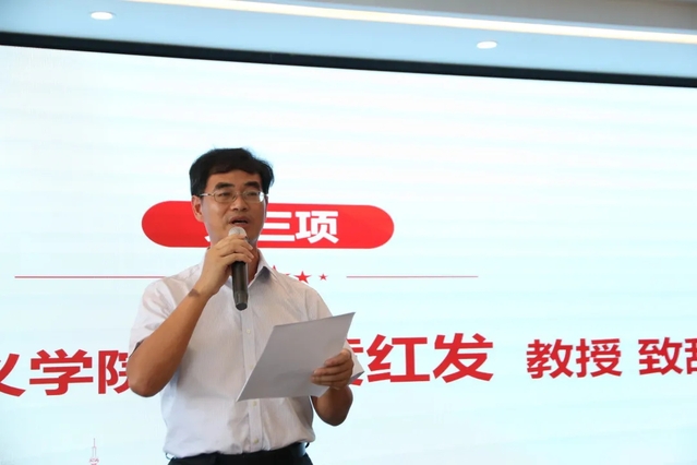接着,我院院长黄红发教授讲话。他首先对同学们的如期到来表示热烈的欢迎。随后,黄红发为大家介绍马克思主义学院的优势和特色:拥有首批全国高校“黄大年”式教师团队、首批国家一流本科课程思想、湖北省一流专业建设点、湖北省省级示范教学基地、省级优势特色学科群等,同时我院学子连续八年考研升学率稳居全校第一,毕业生就业率高达90%。最后,黄红发对全体新生提出几点期待和要求:一是要常怀爱国心,报国情和强国志;二是坚持马院信马,在马言马;三是力行德、智、体、美、劳全面发展,练就七大综合素养。同时希望同学们经过四年培养之后都会成为学院乃至二师的骄傲。
