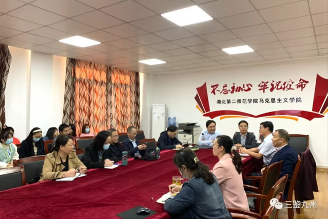 在庆祝湖北第二师范学院建校90周年之际,为提升我院师生科研水平,由科研处主办,马克思主义学院(以下简称马院)与新时代基层治理现代化研究中心共同承办的C刊进校园活动于2021年10月29日上午在马院会议室举行,马院全体教职工、思想政治教育专业18级学生代表参加,马院黄红发院长主持。本次活动特邀嘉宾是具有深厚学术造诣和丰富审稿经验的华中师范大学政治与国际关系学院副院长、《社会主义研究》常务副主编王建国教授和《社会主义研究》执行编辑周华平副教授。