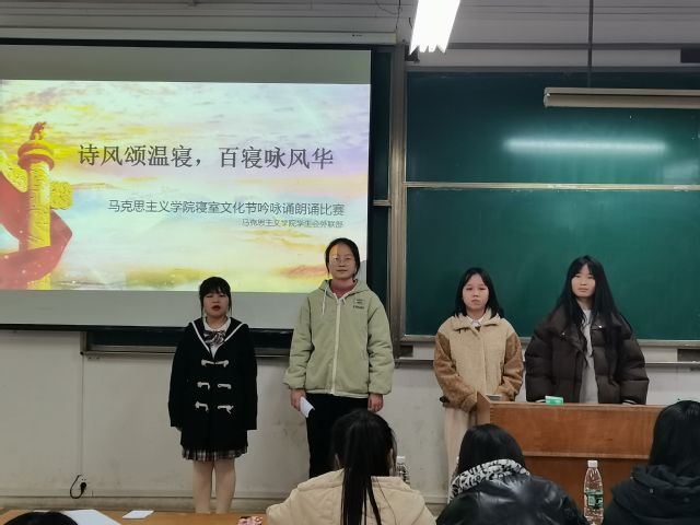 本网讯(通讯员 罗心雨)12月2日晚,我院于2号教学楼2210教室举行“诗风颂温寝,百寝咏风华”主题朗诵比赛。我院2020级思想政治教育1班卢友宜、单馨怡、崔珊珊、罗桂西担任评委,来自我院五个寝室的共五组选手参加比赛。