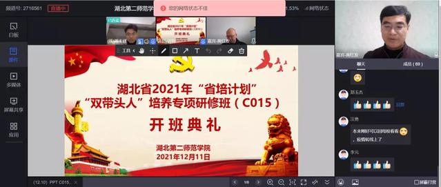 12月11日上午,湖北第二师范学院马克思主义学院(以下简称马院)承办的湖北省“中小学幼儿园教师素质提升工程”(2021)——“双带头人”培养专项研修班在网络平台正式开班。湖北第二师范学院校党委常委、副校长黄颂出席典礼并讲话,来自湖北省各县市一线中小学100名教师参与开班典礼,马院院长黄红发教授主持仪式。
