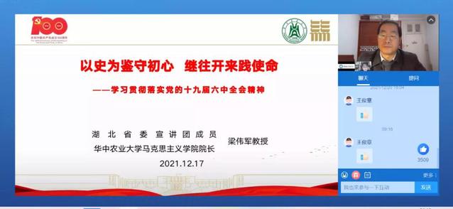12月17日上午,湖北省委宣讲团成员、华中农业大学马克思主义学院院长梁伟军教授为湖北省2021年“双带头人”培养专项研修班作主题为《以史为鉴守初心,继往开来践使命》专题讲座,培训班全体成员听取讲座。