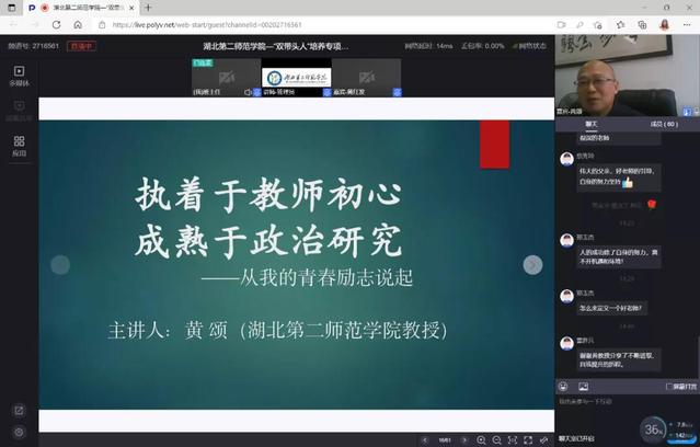 12月17日下午,湖北省2021年“中小学幼儿园教师素质提升工程”——“双带头人”研修培训项目于线上继续开展。湖北第二师范学院校党委常委、副校长黄颂教授做主题为《执着于教师初心,成熟于政治研究——从我的青春励志说起》专题讲座,培训班全体学员听取讲座,马克思主义学院院长黄红发教授主持。