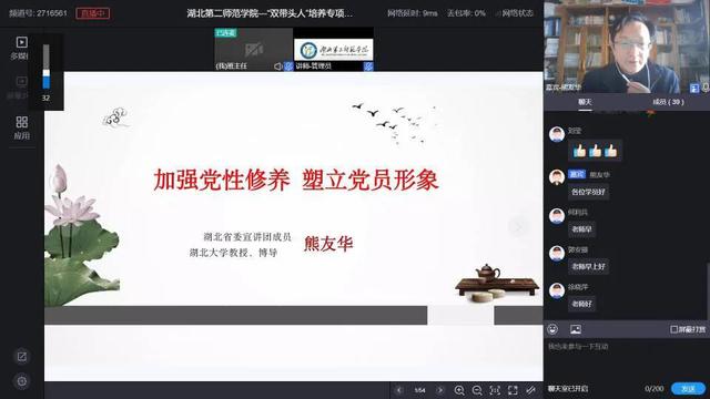 12月18日上午,湖北大学马克思主义学院院长、教授、博士生导师、教育部高校思政课教指委委员熊友华为湖北省2021年“中小学幼儿园教师素质提升工程”——“双带头人”专项培训班作《加强党性修养,塑立党员形象》专题讲座,讲座以线上直播的方式进行。培训班全体学员前来听取讲座。