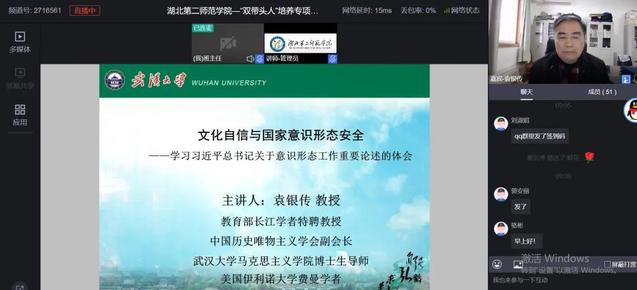 12月15日上午,武汉大学马克思主义学院教授、博士生导师袁银传为湖北省2021年“双带头人”专项培训班作《文化自信与维护国家意识形态安全》专题讲座,讲座通过线上直播的方式进行。培训班全体成员前来听取讲座。