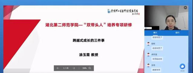 12月15日下午,湖北省特级教师、湖北第二师范学院教授涂玉霞作《跨越成长的三件事》专题讲座,湖北省“双带头人”培养专项研修班全体学员参加,此次讲座通过网络直播的方式进行。