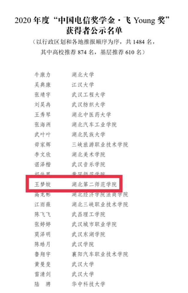 近日,2020年度“中国电信奖学金”名单公布。经校级、地市级分别推荐、省级初评和全国评审,湖北第二师范学院马克思主义学院(以下简称马院)王梦姣同学在评选中脱颖而出,获得了2020年度“中国电信奖学金·飞Young奖”。