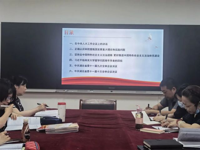 活动主要学习了习近平总书记在中央人大工作会议上的讲话、正确认识和把握我国发展重大理论和实践问题、坚持走中国特色社会主义法治道路更好推进中国特色社会主义法治体系建设、习近平总书记给南京大学留学归国青年学者的回信、中共湖北省委十一届九次全体会议决议和中共湖北省委十一届十次全体会议决议等六个方面的内容。