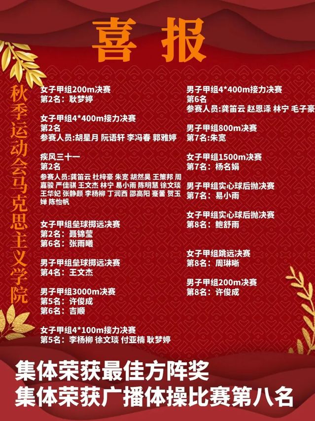 10月25日,湖北第二师范学院2022年秋运会落下了帷幕。在为期两天的运动会中,马克思主义学院(后简称马院)的运动健儿们勇往直前,奋勇拼搏,尽显青春活力。一份耕耘,一份收获,拼搏的汗水终凝结成了胜利的果实,他们,用自己的努力为马院挣得了荣誉。